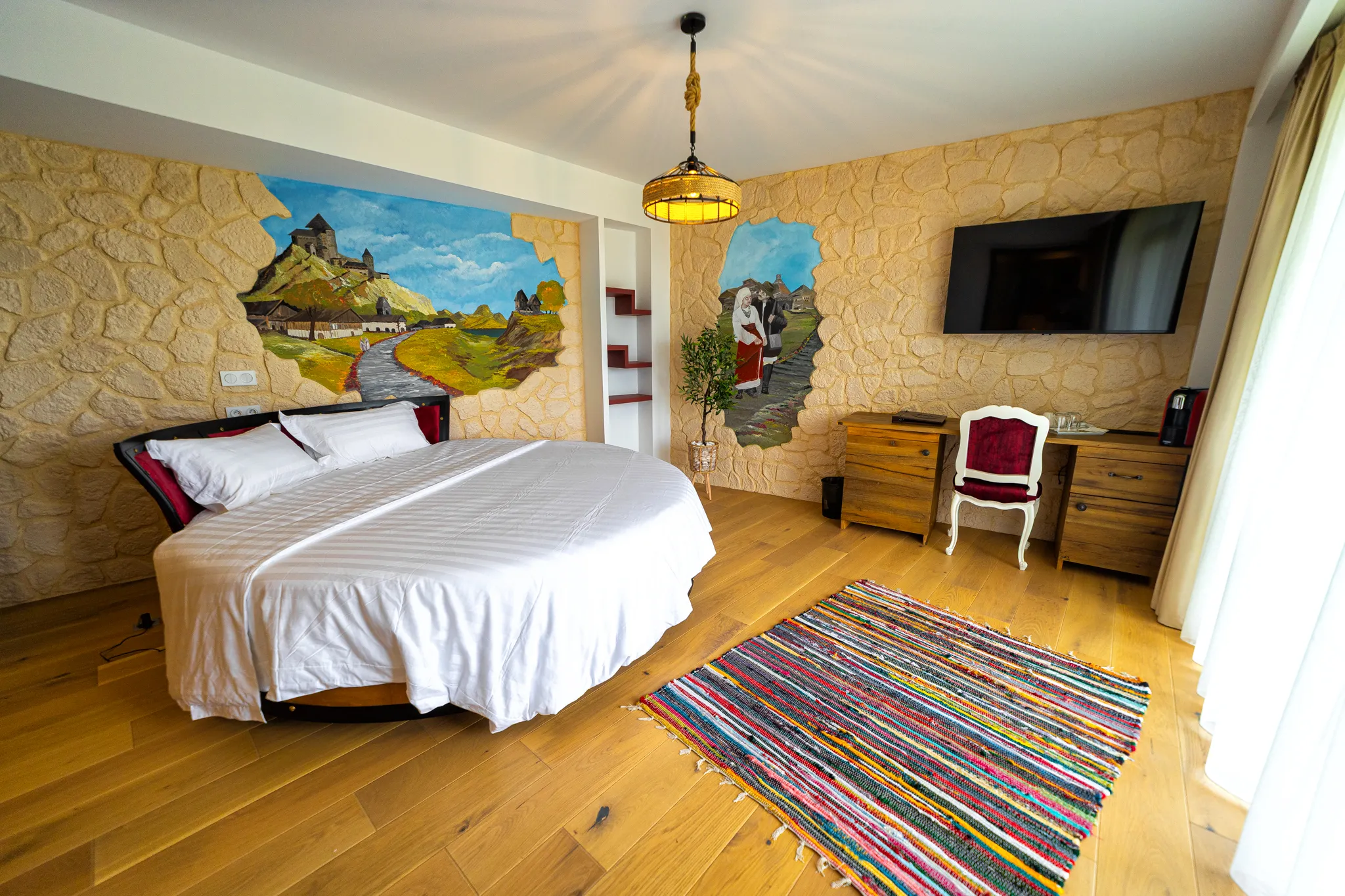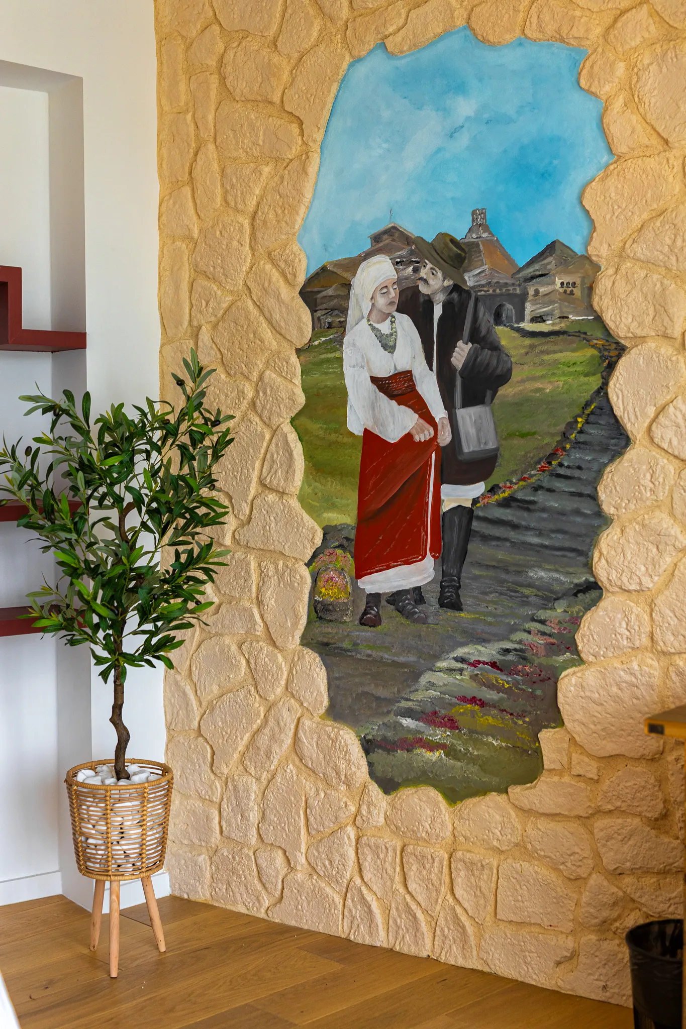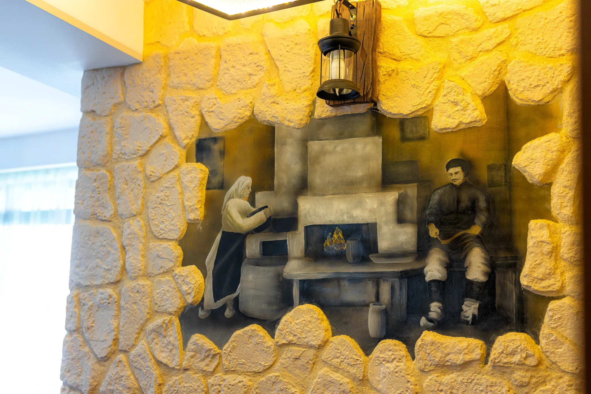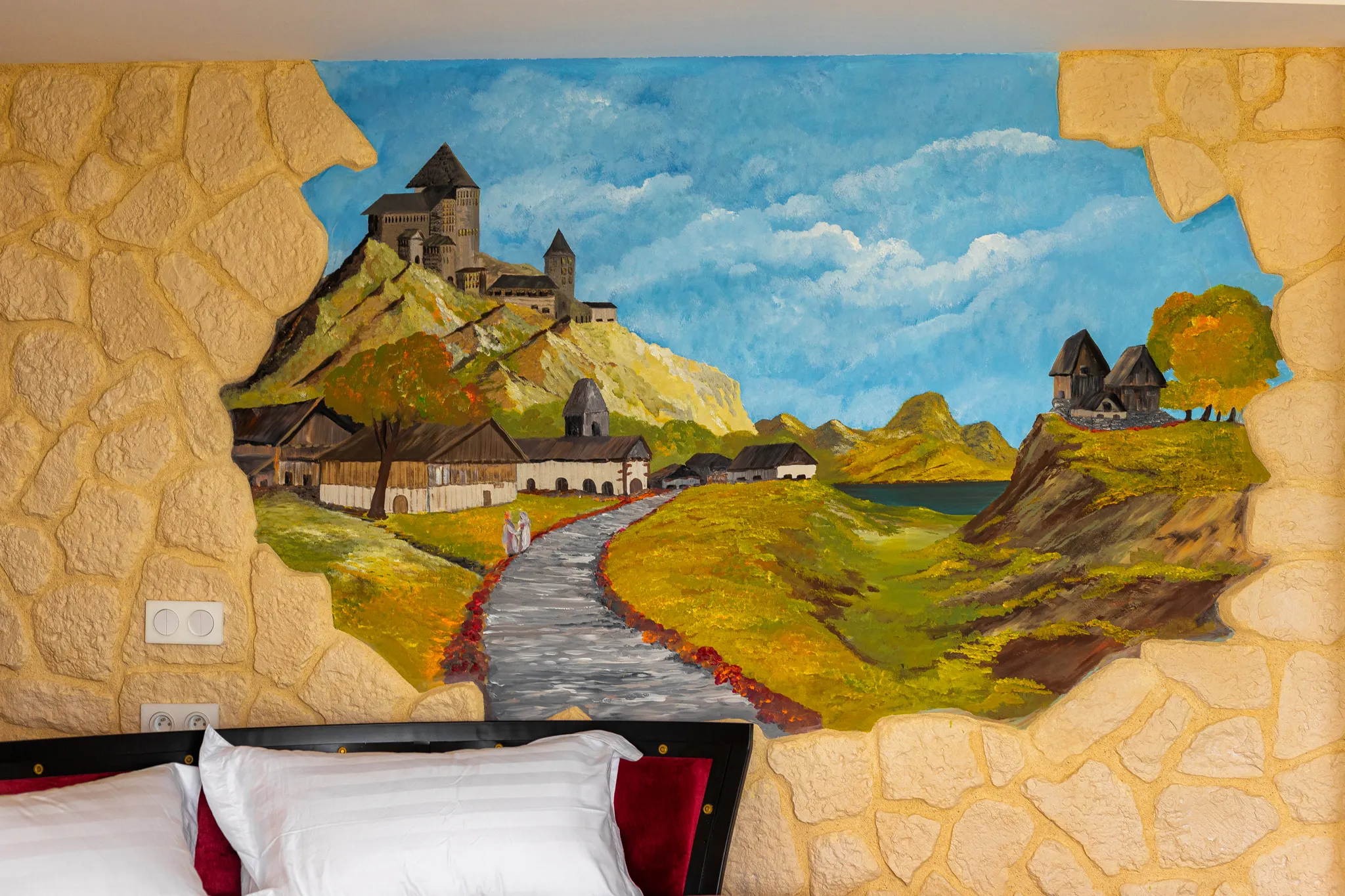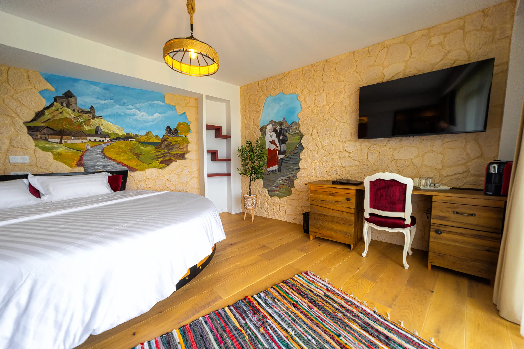 Aici, unde satul se îmbrățișează cu pădurea și muntele străjuiește tăcut la orizont, odihna capătă alt rost. Pictura aduce laolaltă imaginea Moldovei vechi: căsuțe risipite printre dealuri, fumul vetrelor și liniștea codrului ce păzește din umbră. Este o odaie pentru suflete care vor răgaz, rădăcini și priveliști ce nu se uită ușor.