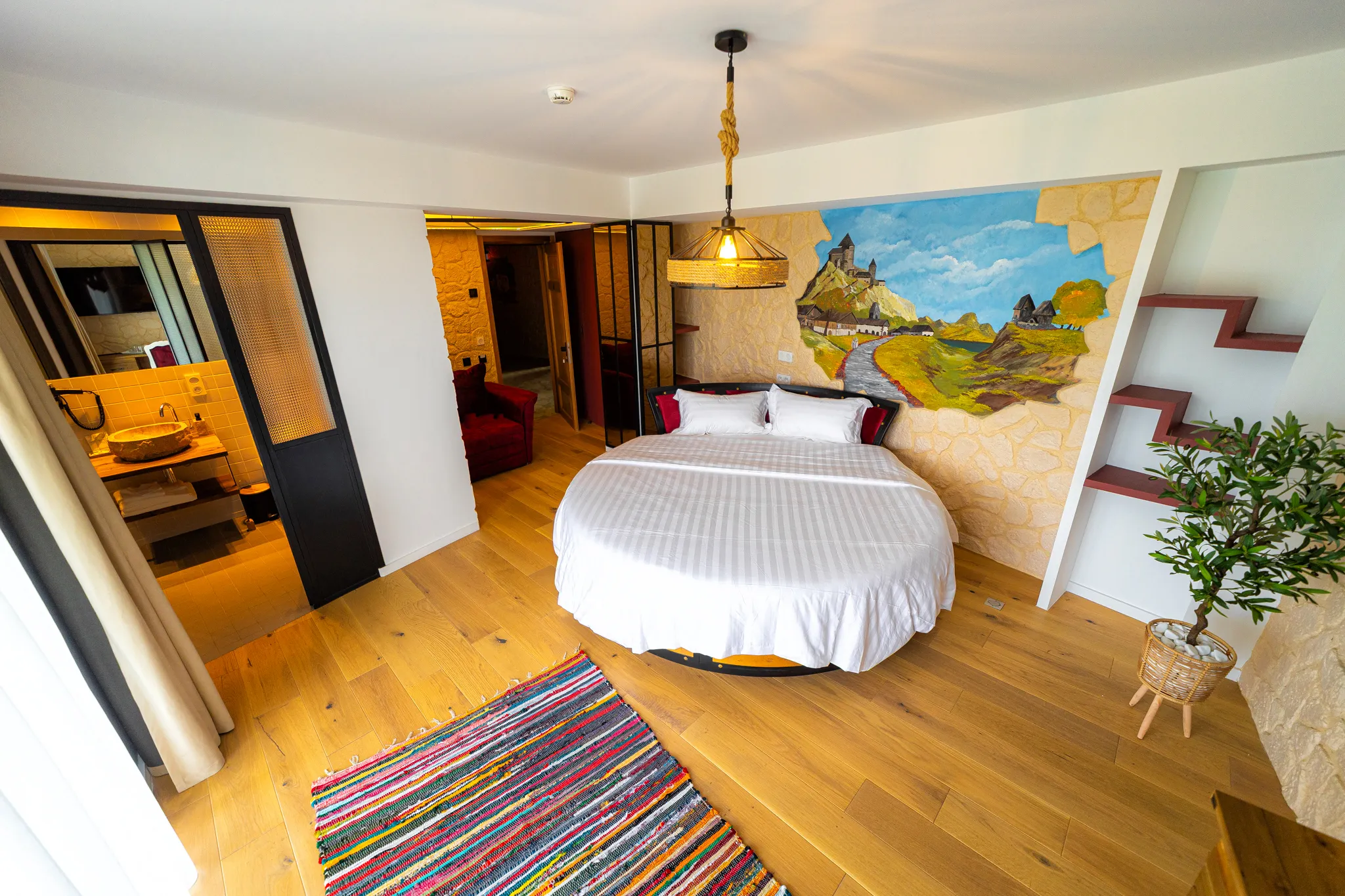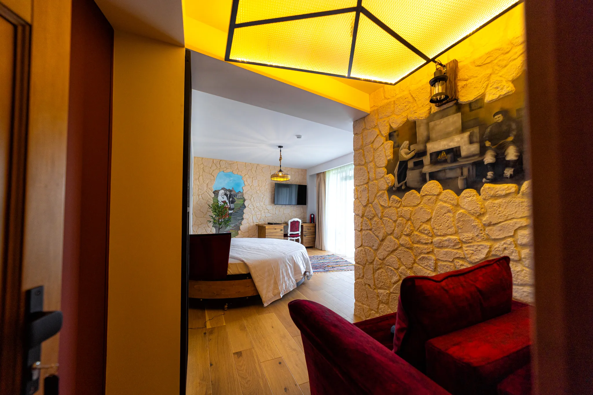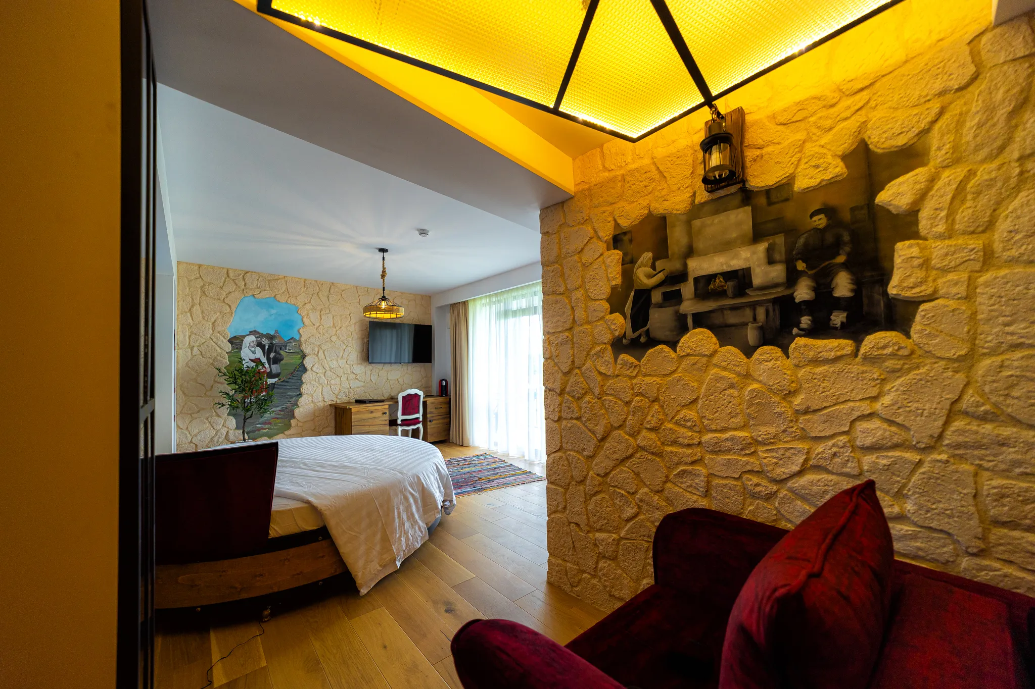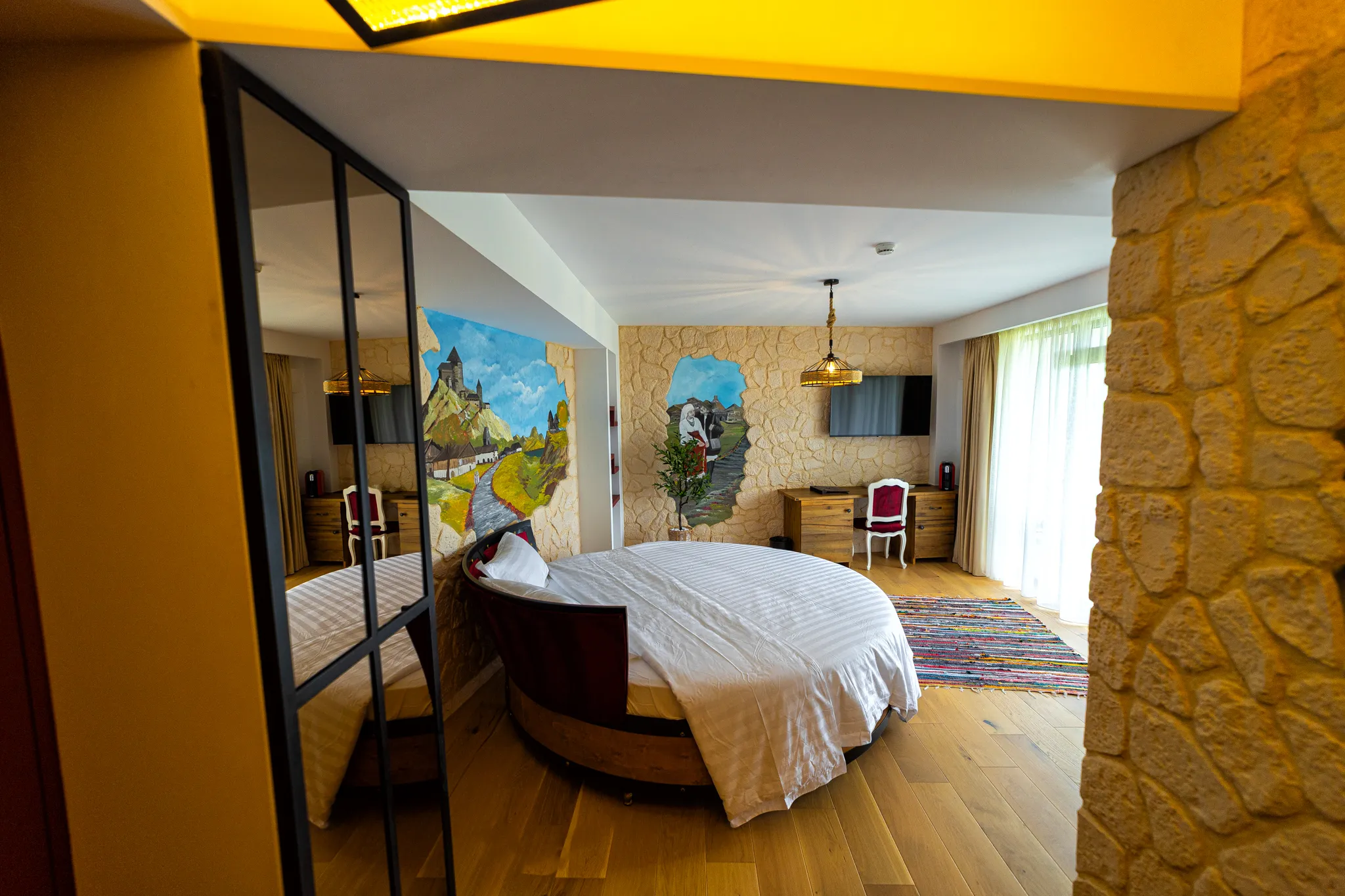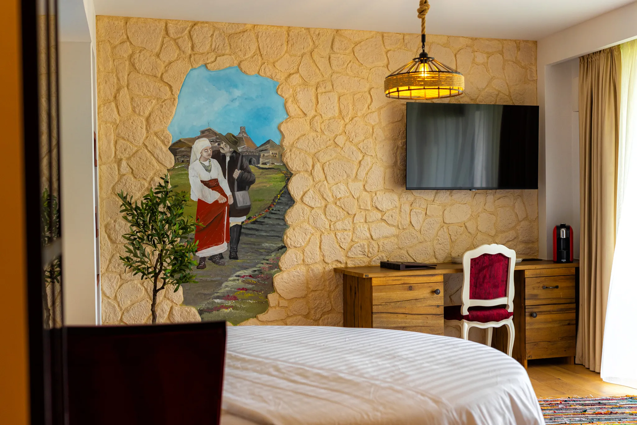 Aici, unde satul se îmbrățișează cu pădurea și muntele străjuiește tăcut la orizont, odihna capătă alt rost. Pictura aduce laolaltă imaginea Moldovei vechi: căsuțe risipite printre dealuri, fumul vetrelor și liniștea codrului ce păzește din umbră. Este o odaie pentru suflete care vor răgaz, rădăcini și priveliști ce nu se uită ușor.